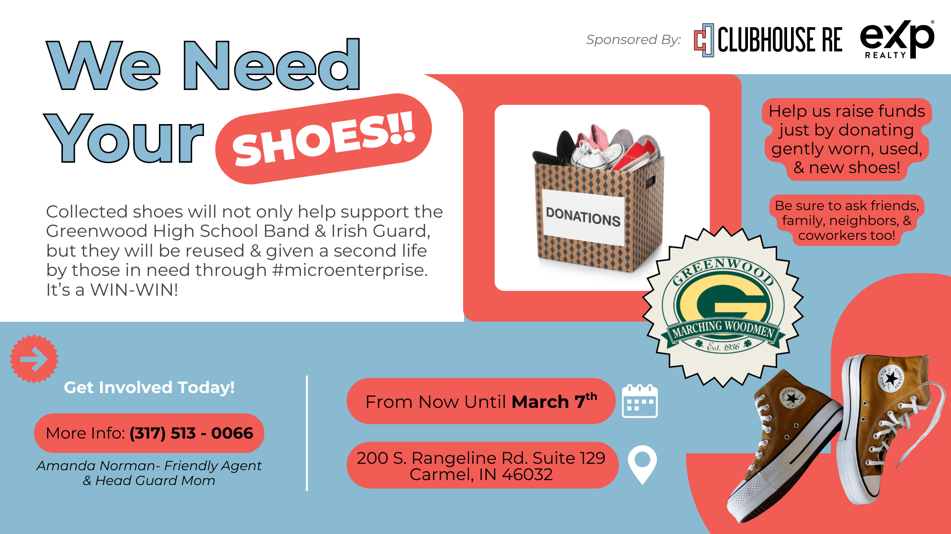 Drop off shoes in person at The Clubhouse anytime now through March 7